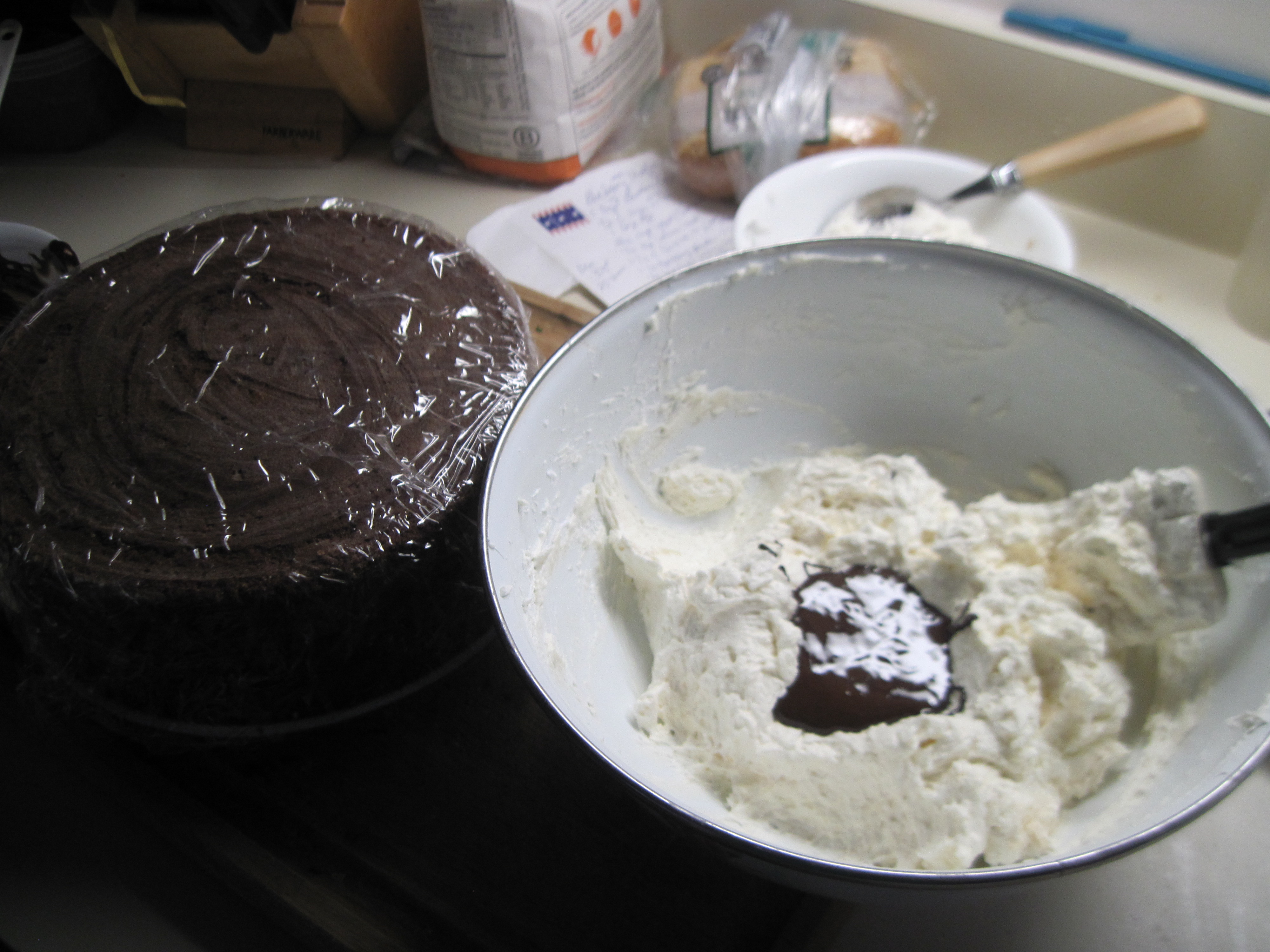 Under the assistance of my two sous chefs, I almost forgot to add water to the cake batter ingredients and noticed it almost too late.   I gave them the cake beaters to lick and had sent them on their way (yes…I let them lick raw batter.  We are rebels.)      I also had to make an adjustment to compensate for not having unsweetened baker’s chocolate, and not semi-sweet.  I think there is still a forehead impression in my cabinet door.  Then I realized that I only had enough baker’s chocolate left to make the cake, but only enough left to do half of the chocolate Swiss buttercream recipe and half the ganache.   This was not going as I envisioned.  Luckily, Dr. Google helped me.  If you add 1 tablespoon of sugar per ounce of chocolate that gets you to a semi-sweet state.