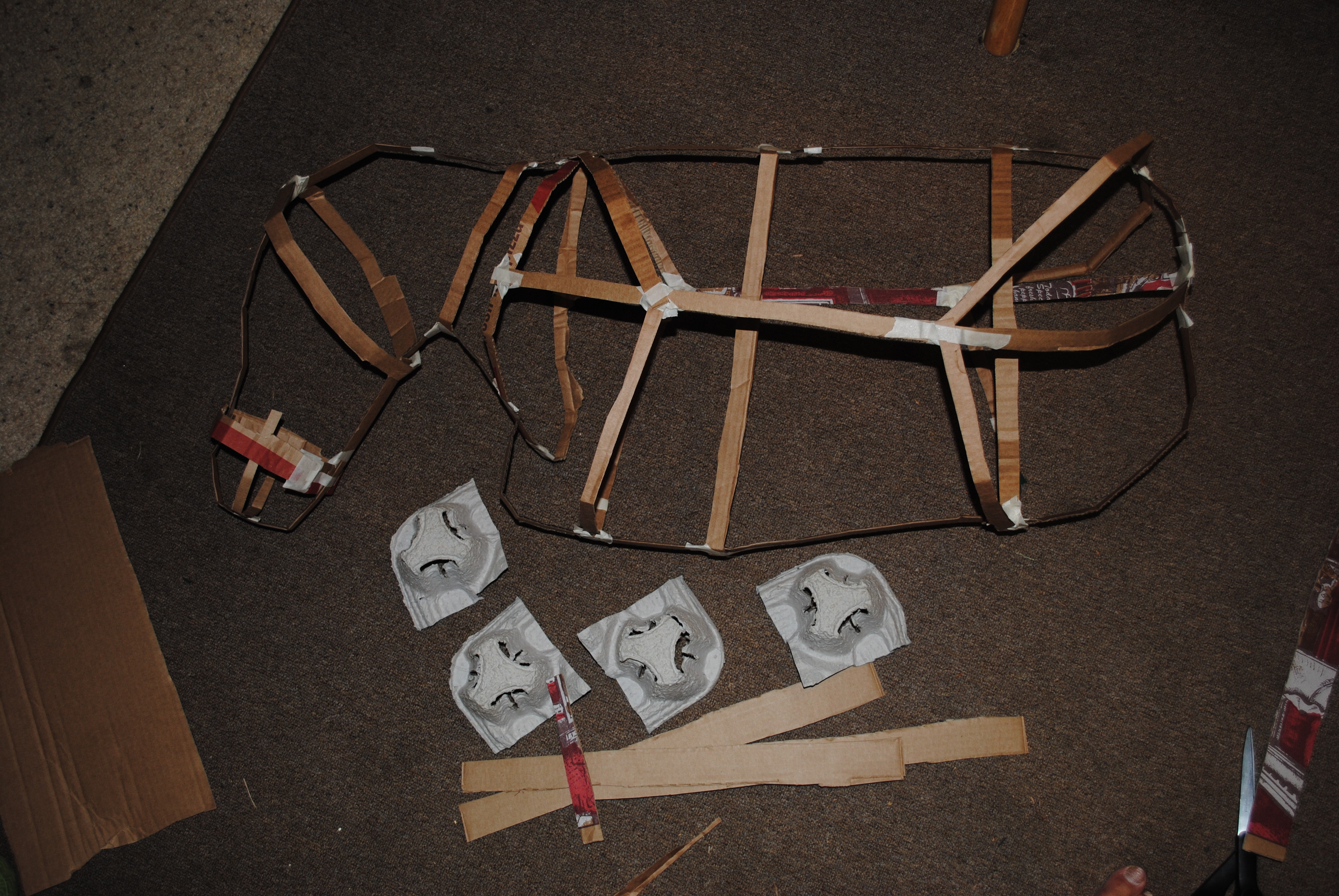 I finish the body frame feeling so proud that it looks like a horse and I take a moment to ponder the legs. I rummage through our recycling and find a cup holder that speak to me and I cut them up into four hooves. I am looking at the frame now thinking the head needs a bit more of a My Little Pony shape so I begin to adjust it. As I snap the photo I begin to think, “Hmm, maybe this is kind of big.”