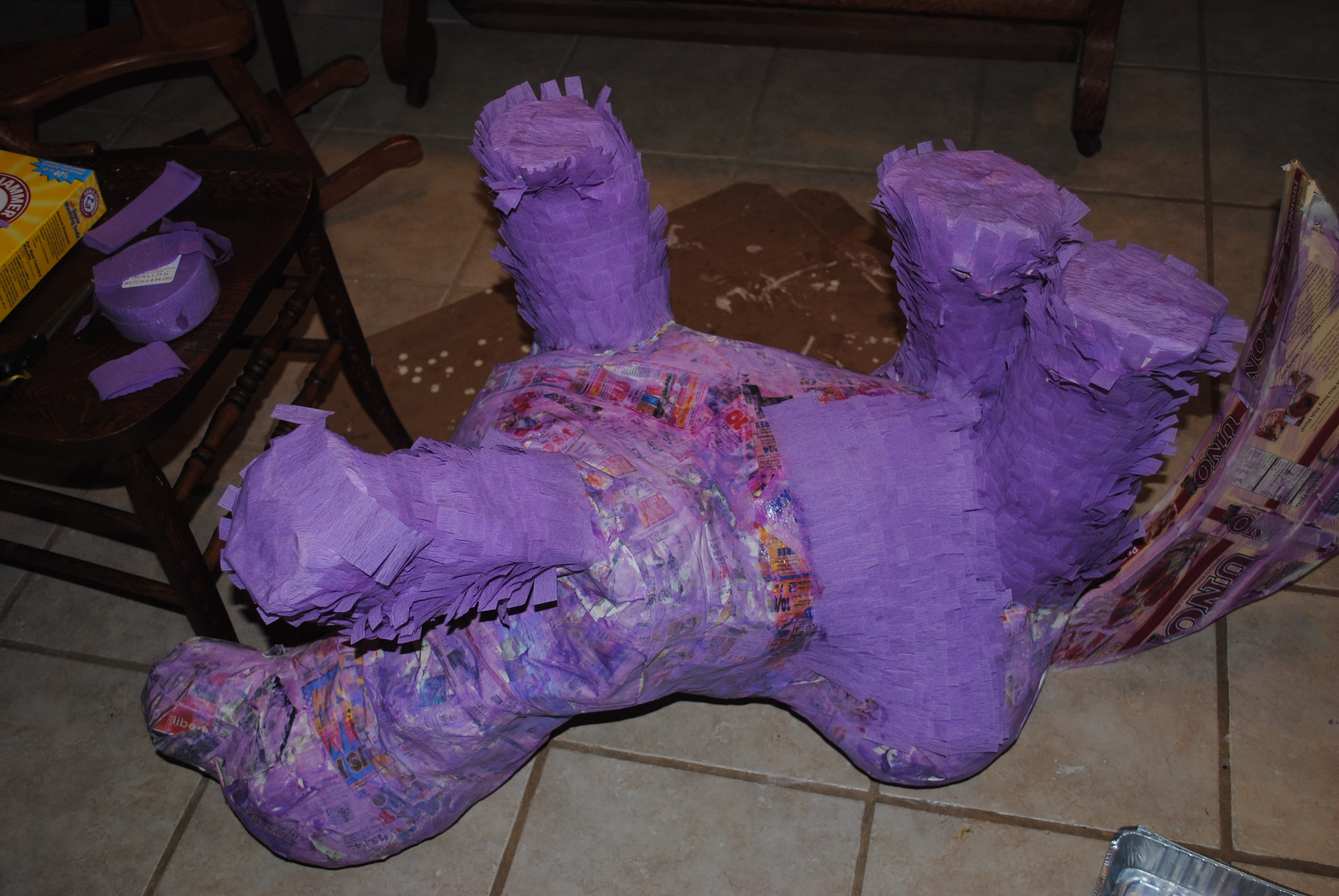 I bet you are thinking it is time to show the finished product. Well, you’d be wrong because there are finishing elements still missing which my daughter so often reminded me over the several hours of the project. What does she think I am going to do? Pull wings and a mane out of my butt like a Sim? Oh, my friends, did you forget about all of those finishing touches? Pony’s have a mane and a face. Princess Twilight Sparkle also has wings — and no five year old is going to miss that important element on her party pinata.