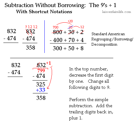 If you have a number like 1000 and from it you subtract 777, that is a lot of borrowing with zeros if you choose to regroup/borrow. You can add up to find the answer, of course. Another way is to decompose 1000 into 999 + 1. Then you subtract 777 from 999 and add back in the extra +1. Since all the digits in the minuend (number being subtracted upon) are 9, the subtraction is easy.
