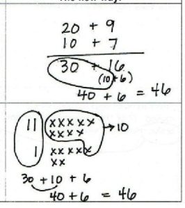 In a standard American algorithm we carry over to the next place value when we have “extra” and make a note by “carrying 1”. How can we show that to a child who doesn’t have a strong grasp of place value? What does it even mean to regroup or carry? Why are we even carrying one (they might ask?)