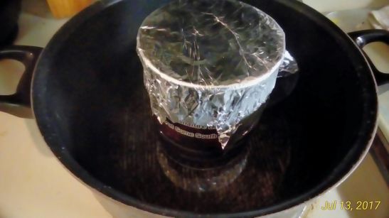 Pour batter into the can (it should read 2/3 of the way up). Cover the top tightly with foil to seal. Place the can into the boiling water on the stove top, cover, and reduce heat to simmer. Let cook this way for 2 hours and 15 minutes. Check the water level halfway through and add more as necessary. For the oven bake in the water bath at 325.